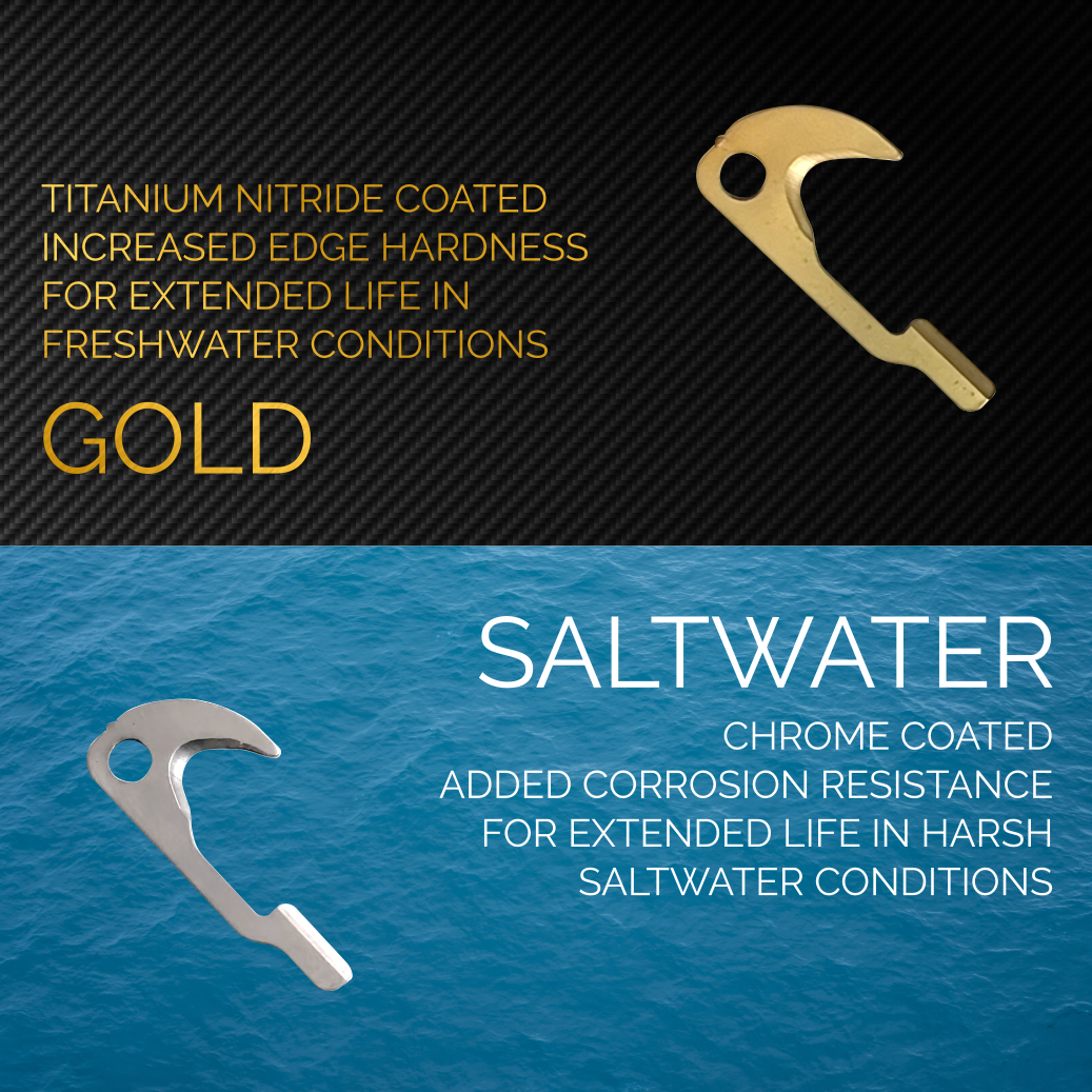 - Titanium-Nitride (GOLD) or Chrome (SALTWATER) coated - The blade coat further increases the stainless steel corrosion resistance, while also increasing edge retention.